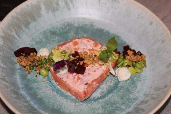 Tartaar van huisgerookte zalm, Flensje , mango, créme fraiche